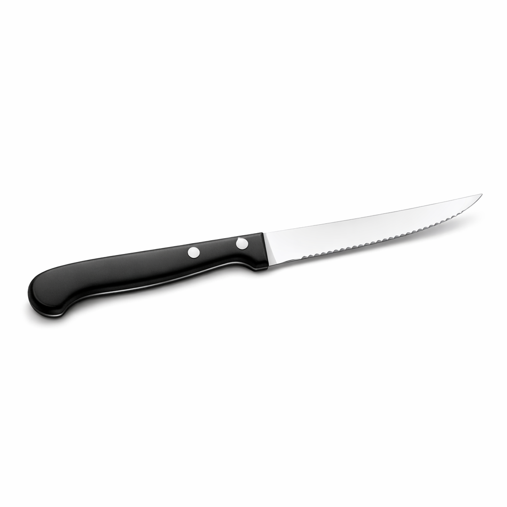 Servez vos viandes facilement avec notre couteau à steak au manche plastique noir.