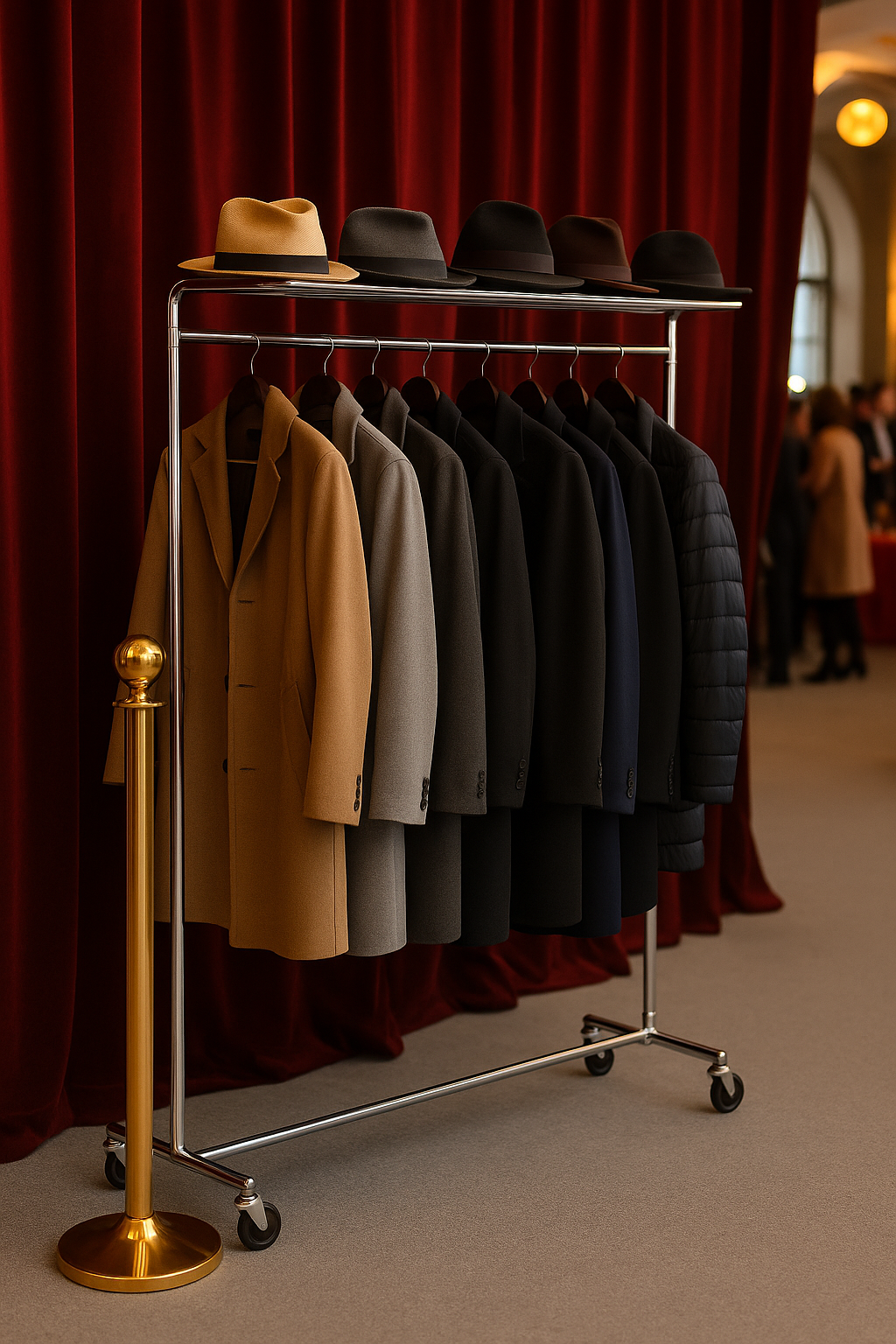 Cet Ensemble Vestiaire PORTE-CHAPEAUX loué avec 40 cintres est conçu pour suspendre manteaux, vestes et accessoires, tout en offrant un espace dédié pour les chapeaux ou casques.