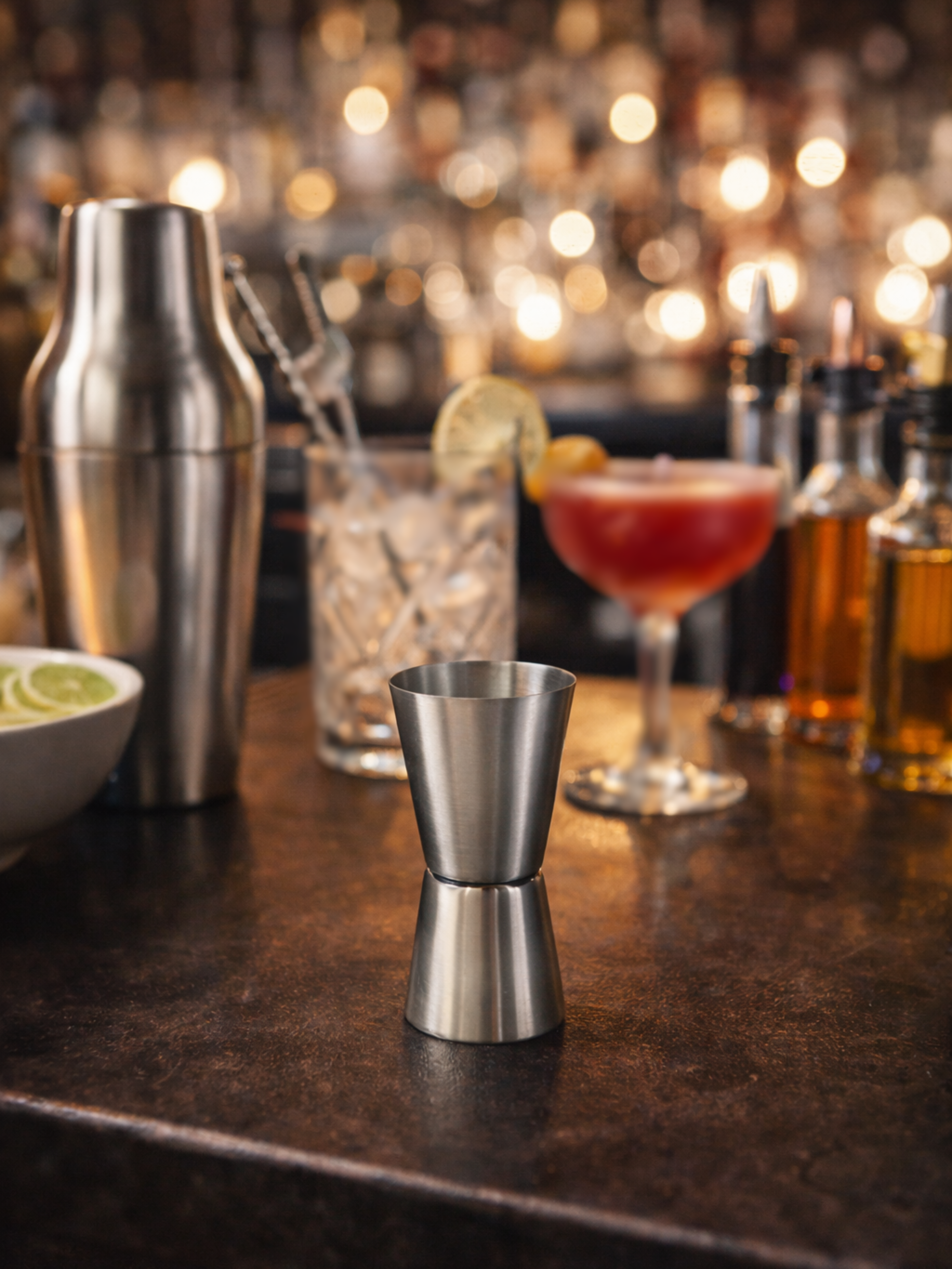 Doseur à cocktail double mesure avec 2 cl d’un côté et 4 cl de l’autre, idéal pour réaliser des cocktails précis et équilibrés.
