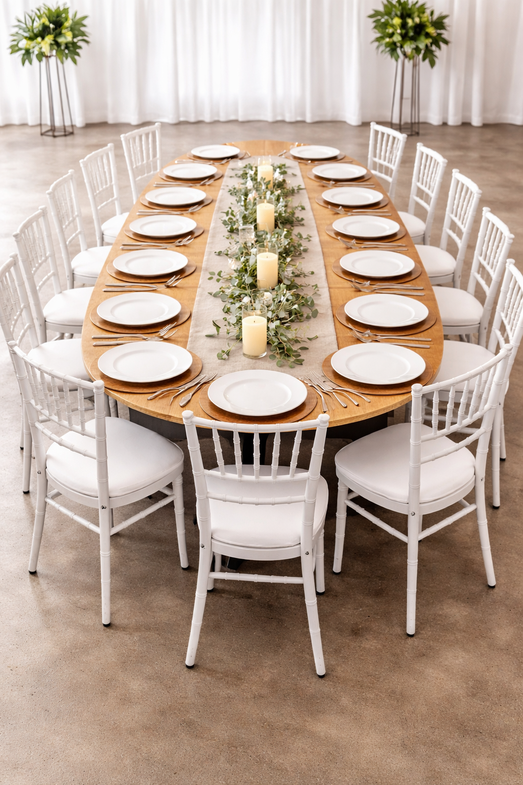 Spacieuse et élégante, cette table ovale en bois est parfaite pour vos repas de mariage, réceptions haut de gamme, repas familiaux ou événements d'entreprise.